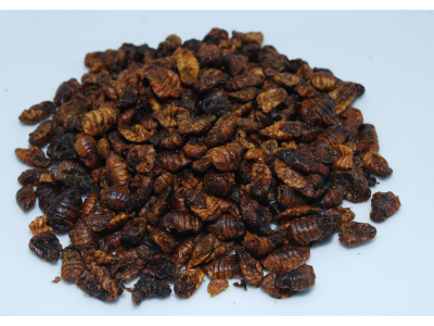 Seidenraupenpuppen sind verpuppte Seidenraupen und ein gutes proteinhaltiges Futter für Terrarientiere. Im Behälter aufbewahrt halten sie lange Zeit und können nach und nach verfüttert werden.