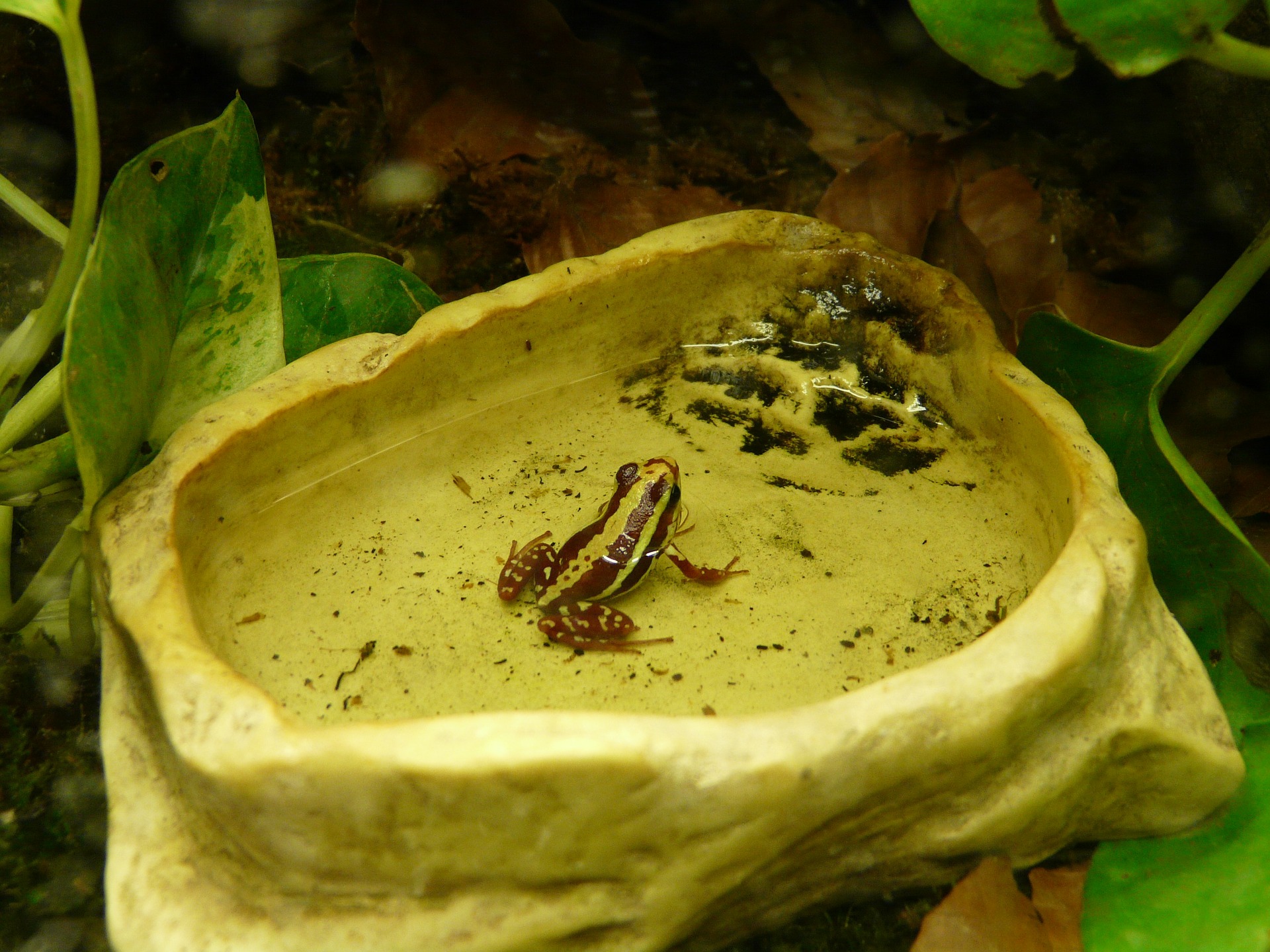 Überhaupt empfiehlt sich für alle Arten ein größerer Wasserteil wie eine flache Wasserschale oder ein Wasserlauf, je nach Beschaffenheit des ursprünglichen Biotops. Für manche Arten kann ein künstlicher Wasserfall mit Auffangbecken nötig sein.