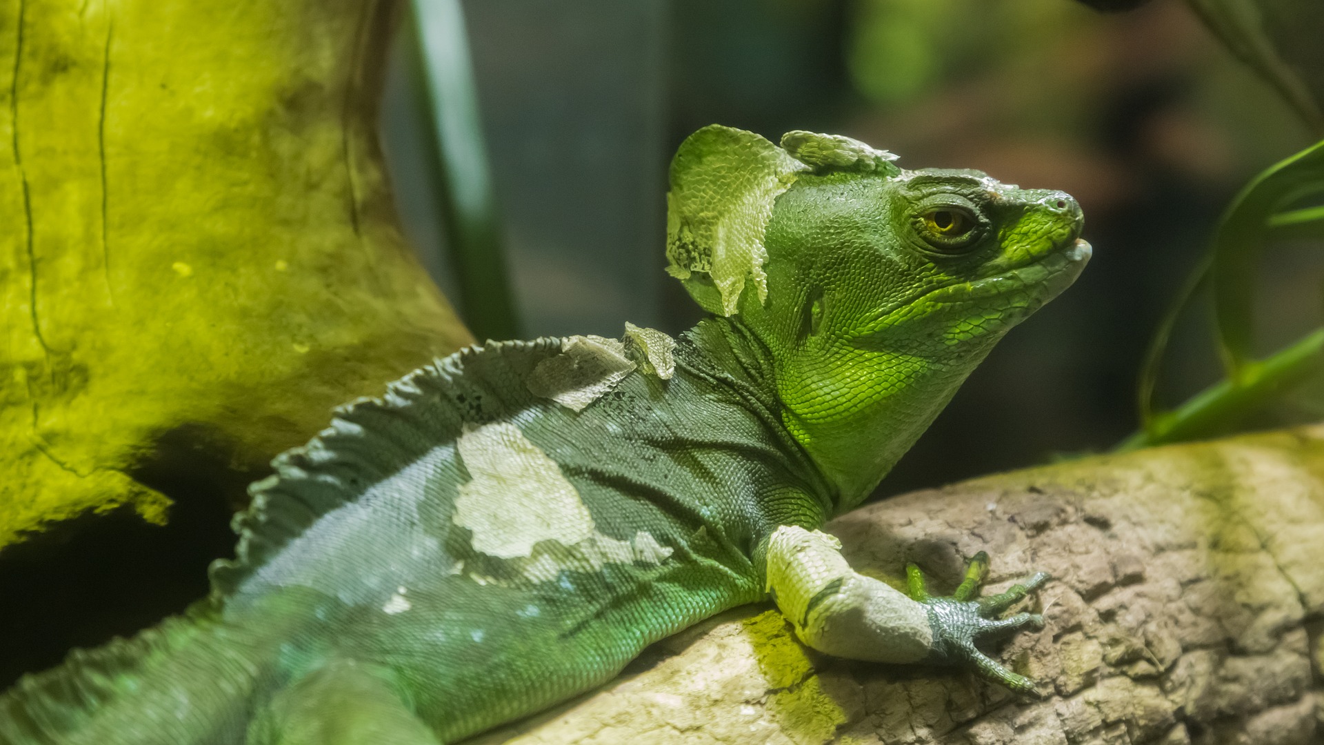 Die Grüne Wasseragame ist der kleine Verwandte des Grünen Leguan. Klein allerdings nur im direkten Vergleich. Denn auch die grüne Wasseragame wird durchschnittlich 65-75 cm lang, einzelne Exemplare erreichen auch schonmal eine Länge von 1 m. Schon eine Einzelhaltung erfordert also viel Platz. Eine artgerechtere Haremshaltung von einem Männchen mit bis zu drei Weibchen setzt dementsprechend nicht nur ein sehr großes Raumangebot voraus. Der Halter steht vor der Aufgabe, ein Tropenterrarium mit vielen Klettermöglichkeiten, großem Wasserteil, entsprechenden Temperaturen und Leuftfeuchtigkeit in großem Stil umsetzen zu müssen. Keine leichte Verantwortung, bedenkt man die Lebenserwartung von bis zu 20 Jahren.