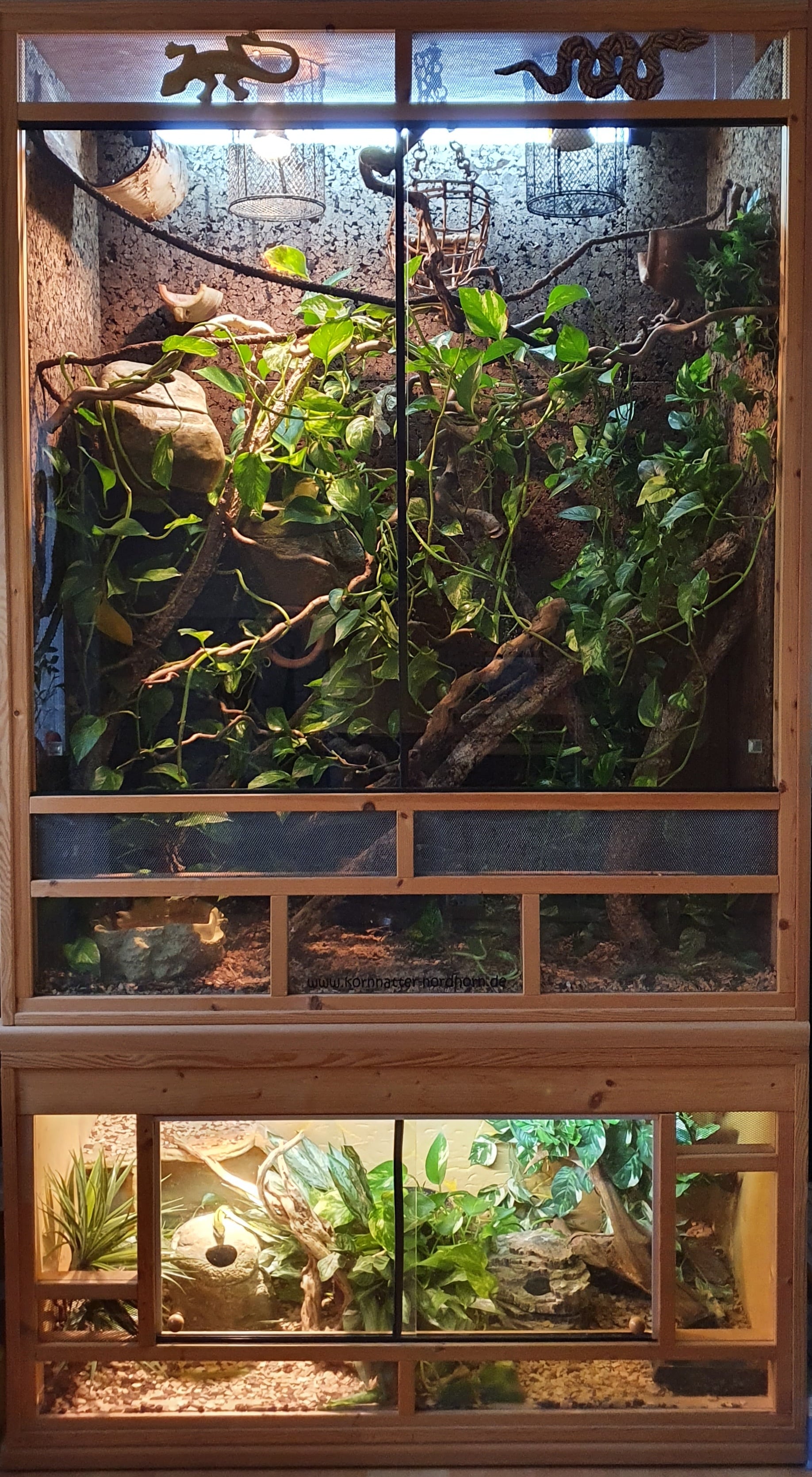 Kornnattern gehören zu den Kletterschlangen und benötigen ein ca. Terrarium von 1,0x0,5x0,8m ( 100x50x80cm) Kunststoffterrarium, welche mit Klettermöglichkeiten, wie Kork äste, Korkröhren sowie Höhlen, ausgestattet werden sollten, die Klettermöglichkeiten in der Form von Ästen sollen nicht zu dick gewählt werden, wir empfehlen hier ca. 1-3cm, je nach Größe und Gewicht der Schlange. Die Rückwandgestaltung bei einer Kornnatter sollte eher sperrig ausgewählt sein, eine Korkrückwand eignet sich dafür Ideal. Es ist darauf zu achten, gerade bei der Haltung von jungen Schlangen, dass die Rückwände nicht mit „Doppelseitigem Klebeband“ befestigt werden.