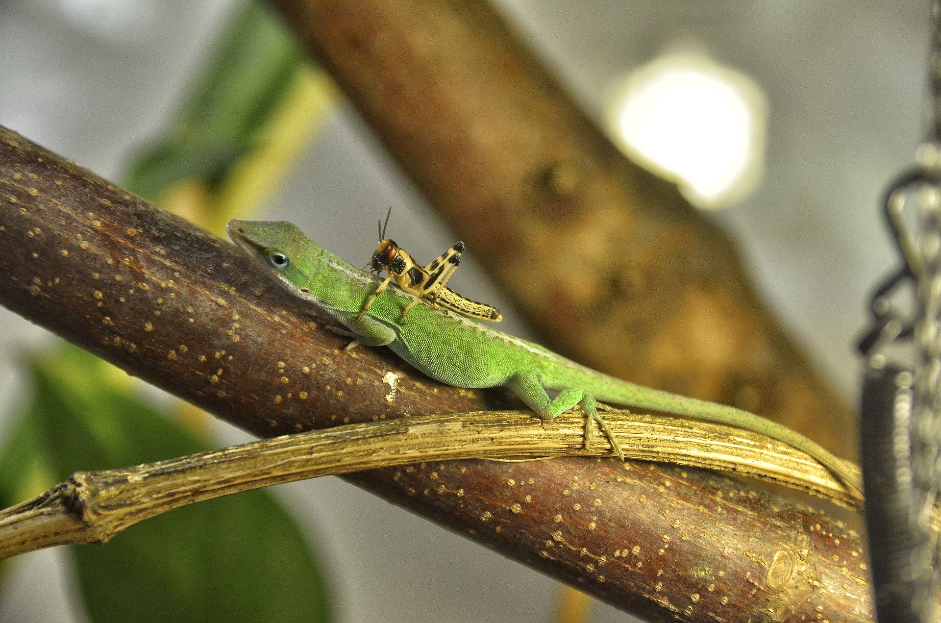 Der Grüne Anolis ist ein Lauerjäger, der alles erbeutet, was ins Maul passt. Dazu gehören Futterinsekten wie Grillen und Heimchen, aber auch Fliegen und Spinnen. Für eine artgerechte Haltung ist das Ausleben des Jagdtriebes wichtig. Die Tiere müssen mit Lebendfutter versorgt werden. Da sie keine Zähne, sondern lediglich Häkchen zum Festhalten der Beute haben, werden gerade größere Tiere mit dem Hinterteil zuerst verspeist. So ist die Wahrscheinlichkeit geringer, dass sich die Beute im Maul verklemmt. Für eine ausgewogene Ernährung ist es nötig, die Futtertiere bei jeder zweiten Fütterung mit Vitaminen und Mineralien zu bestäuben. Adulte Tiere fressen 3-4 mittelgroße Heimchen pro Tag, es muss also täglich in ausreichender Menge gefüttert werden. Ihren Wasserbedarf decken die kleinen Echsen, indem sie Wassertropfen von Blättern und Scheiben lecken. Vor und während der zweimonatigen Winterruhe wird weniger bzw. gar nicht gefüttert.