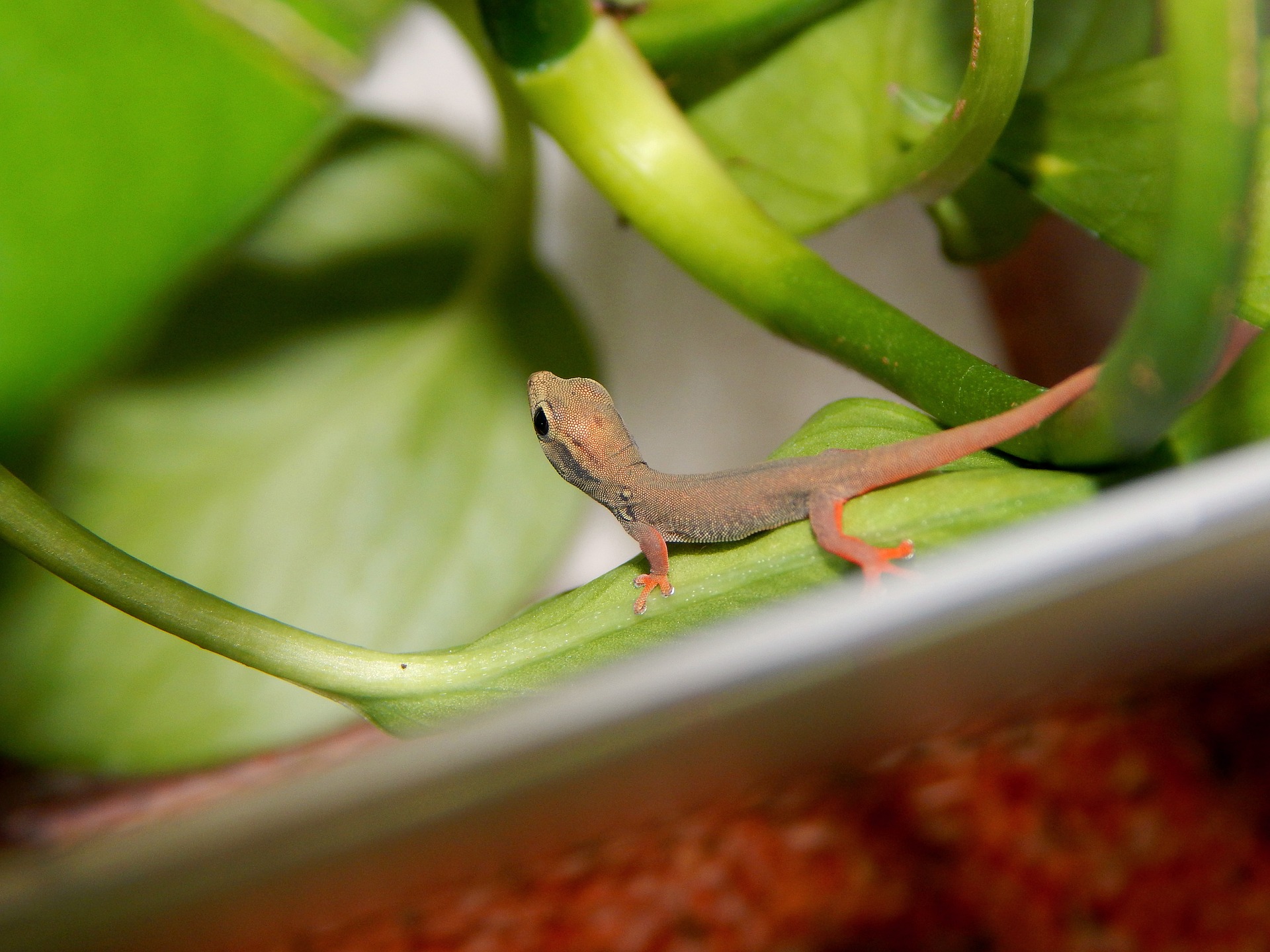 In seinem natürlichen Lebensraum verfügt der Zwerggecko über viele Kletter- und Versteckmöglichkeiten in Form von Ästen und Blättern. Wenn man drei Seiten des Terrariums mit Kork verkleidet, Äste senkrecht und horizontal einbringt sowie Ranken und großblättrige Pflanzen dazwischen setzt, kommt man dem sehr nahe. Ergänzen kann man gut mit einer Höhle und/oder Wetbox. Der Bodengrund kann aus 2-3 cm Sand oder einem Gemisch aus Sand und ungedüngter Erde bestehen. Auch Pflanzen dürfen weder gedüngt noch gespritzt sein, am besten hält man sich an Pflanzen aus dem Zoofachhandel. Außerdem müssen natürlich für den Gecko ungefährliche Pflanzen wie Ficus, Bromelien oder Bogenhanf gewählt werden. Echte Pflanzen wirken sich positiv auf das Klima im Terrarium aus. Man kann aber auch pflegeleichte Dekopflanzen nehmen. In jedes Zwerggecko-Terrarium gehört zudem eine Wasserschale mit frischem Wasser.