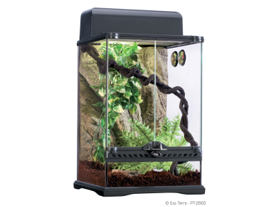 Exo Terra Glass Terrarium - Compact Top - Hygromometer - Thermometer - Rock Background - Water Dish Small - Plantation Soil - Jungle Plant Croton - Jungle Plant Amapallo - Jungle Vine Medium - Jungle Fern Small - Gebrauchsanleitung
