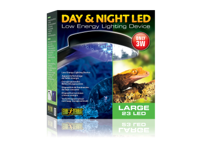 Die Exo Terra Day & Night LED ist ideal für Reptilien, Amphibien und Wirbellosen ohne UVB-Anforderungen, wie Schlangen, nachtaktive Geckos, Frösche, Molche, Salamander, Spinnen, Skorpione, Insekten, usw… . Die hochweißen LEDs (1) sorgen für ein schönes Tageslicht. Die blauen LEDs imitieren einen Mondlichtschimmer, mit dem Sie Ihre Tiere auch während der Nacht beobachten können, ohne sie in ihrem natürlichen Verhalten zu stören. Das sanfte Licht der blauen LEDs ermöglicht es nachtaktive Tiere in ihrem Revier nach Insekten, paarungswillige Artgenossen, usw…zu suchen, bei vollständiger Dunkelheit währen diese Tiere völlig desorientiert. Drücken Sie einfach nur auf den Knopf (2) mit dem Tag-/Nachtlogo, um von hellem Tageslicht auf ein blaues Nachtlicht umzuschalten (3). Die Exo Terra Tag- & Nacht-LED-Beleuchtung ist eine praktische und energieeffiziente Methode, um Ihr Terrarium am Tag und in der Nacht zu beleuchten. Im Gegensatz zu herkömmlichen Leuchtmitteln, die mehr als 80% der verbrauchten Energie in Form von Wärme verschwenden, beleuchtet die Exo Terra Tag- & Nacht-LED-Beleuchtung Ihr Terrarium mit einem Minimum an Wärme und einem Maximum an Lichtausstoß. Da fast überhaupt keine Wärme produziert wird, reduziert dies das Risiko einer Überhitzung während der Sommermonate und ermöglicht ein natürliches Absinken der Temperatur während der Nacht. Die LEDs in der Exo Terra Tag- & Nacht-LED-Beleuchtung verbrauchen weniger Energie und haben eine längere Lebensdauer verglichen mit anderen Leuchtmitteln.