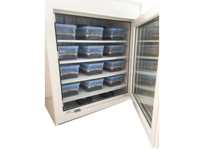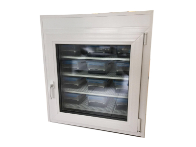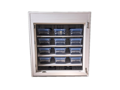 Aufgrund der Abmessung von 82x50x92cm (LxTxH) ist er recht klein, bietet trotz allem ausreichend Platz für bis z. B. 12 Brutboxen in den Abmessungen: 19,5x26x11cm verteilt auf 4 Einlegeböden.