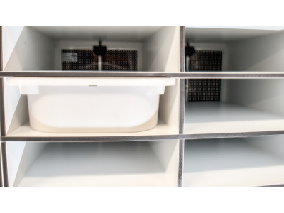 Eine weitere und wichtige Eigenschaft der Kunststoffracks, ist der Sockel von ca. 10cm im unteren Bereich des Racks, es entsteht eine weitere Wärmeisolationsschicht, da das Rack nicht direkt auf dem Boden steht, sowie kann dort ein Thermostat z.B. das TMC-200 verbaut werden, wodurch keine störenden oder sichtbaren Kabel aus dem Rack schauen.